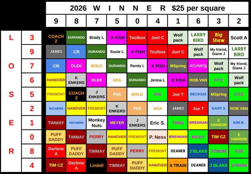 3. If you own the square that matches the last digit of winner and loser you win!
